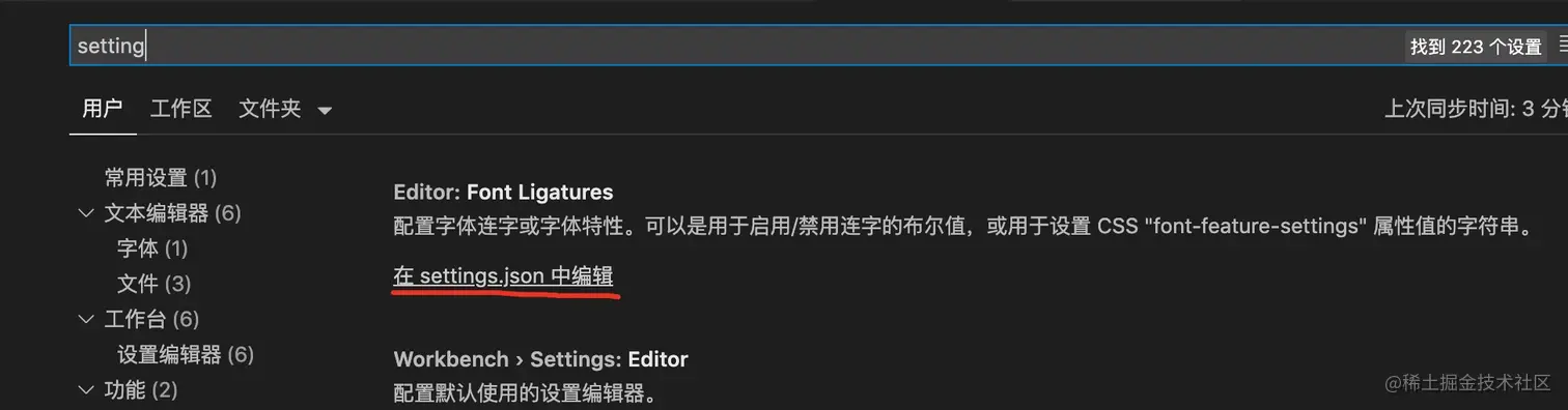 command+,,打开编辑器设置界面,输入框输入setting,打开下面的setting.json文件