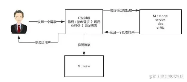 Model2 时代 :学过 Servlet 并做过相关 Demo 的朋友应该了解“Java Bean(Model)+ JSP(View,)+Servlet(Controller) ”这种开发模式,这就是早期的 JavaWeb MVC 开发模式。Model:系统涉及的数据,也就是 dao 和 bean。View:展示模型中的数据,只是用来展示。Controller:处理用户请求都发送给 ,返回数据给 JSP 并展示给用户。