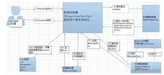 - 客户端(浏览器)发送请求,直接请求到 DispatcherServlet。