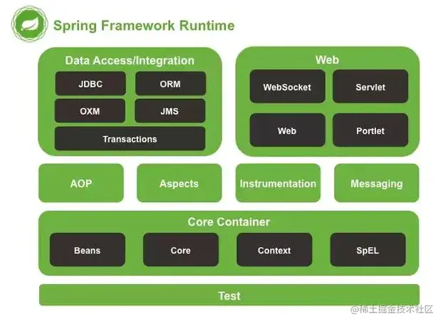 下图对应的是 Spring4.x 版本。目前最新的5.x版本中 Web 模块的 Portlet 组件已经被废弃掉,同时增加了用于异步响应式处理的 WebFlux 组件。