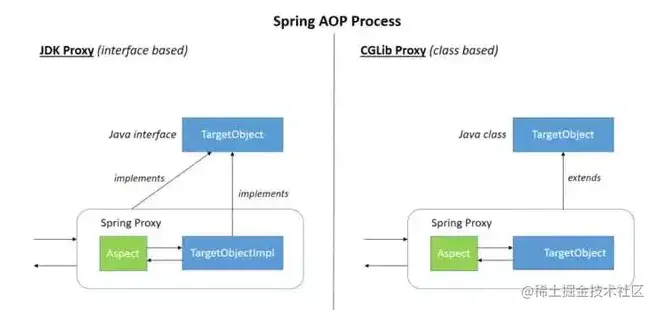Spring AOP就是基于动态代理的,如果要代理的对象,实现了某个接口,那么Spring AOP会使用JDK Proxy,去创建代理对象,而对于没有实现接口的对象,就无法使用 JDK Proxy 去进行代理了,这时候Spring AOP会使用Cglib ,这时候Spring AOP会使用 Cglib 生成一个被代理对象的子类来作为代理,如下图所示: