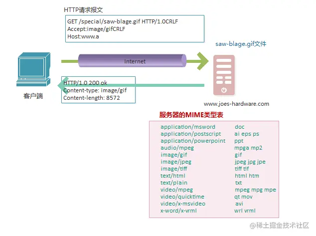 Web服务器可以用文件的扩展名来说明MIME类型。Web服务器会为每个资源扫描一个包含了所有扩展名的MIME类型的文件,以确定MIME类型。Web服务器用MIME类型文件来设置资源输出的Content-type首部。