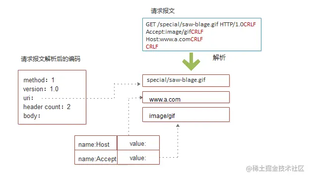 1、解析请求行,查找请求方法、指定的资源标识符(URI)以及版本号,各项之间有一个空格隔开,并以一个回车换行(CRLF)序列作为行的结束;