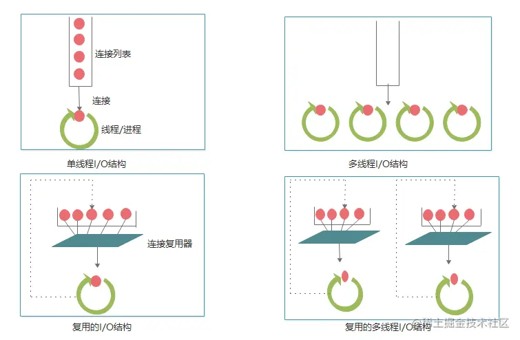 复用I/O的服务器:在复用结构中,要同时监视所有连接上的活动。当连接的状态发生变化时,就对那条连接进行处理,处理结束后,将连接返回到开放的连接列表中,等待下一次的状态变化。只有在有事情可以做时才会对连接进行处理,在空闲连接上等待的时候并不会绑定线程和进程。