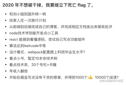 在写总结的时候,一般都是内心有强烈的立 flag 欲望,畅想来年如何如何,然后达到什么成就,然后就把后浪拍死在沙滩上。但是当我行文当这里的时候,突然不知道怎么写了。因为立 flag 很容易,但是写的时候爽一下,然后回头该干啥干啥的,这样很有挫败感的。加之前端技术日新月异,年初说要实现的目的,可能随时就 out 需要更新了,所以思考良久,给自己定下了3个目标