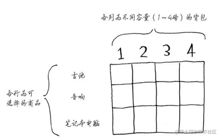 动态规划先解决子问题,在逐步解决大问题。每个动态规划算法都从一个网格开始,背包问题的网格如下: