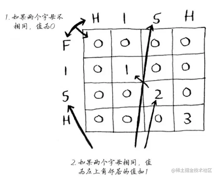 在计算FISH和HISH的最大公共子串时,填写出来的表格和计算公式是: