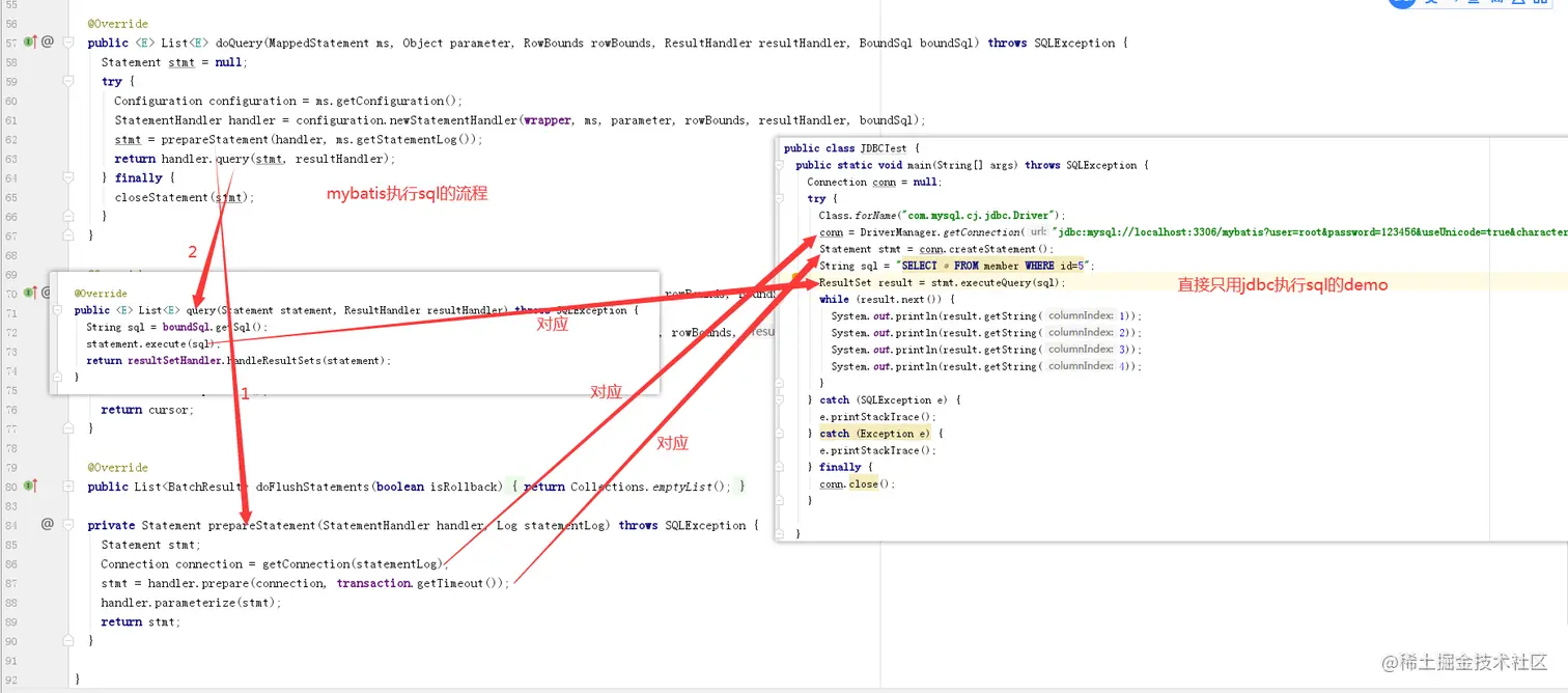 里面的代码还是比较简单的,旁边我还写了一个直接使用jdbc查询的demo进行比较,可以看到主流程已经差不多一致,不同的点在于获取connection和对结果的处理。