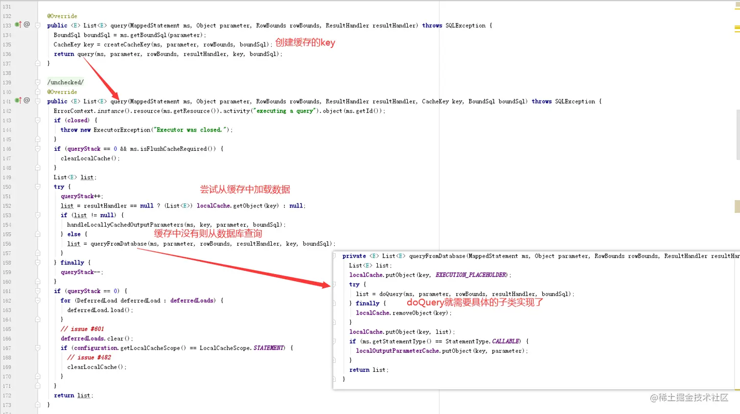 执行器executor上一篇文章有分析,默认是SimpleExecutor这个类,其中包含有全局配置configuration和事务Transaction,而事务Transaction中有从configuration中得到的DataSource,而DataSource中包含有数据库的连接信息。他封装了一些数据库查询。不过上面说到的query方法属于基础方法,在BaseExecutor类中代码如下图: