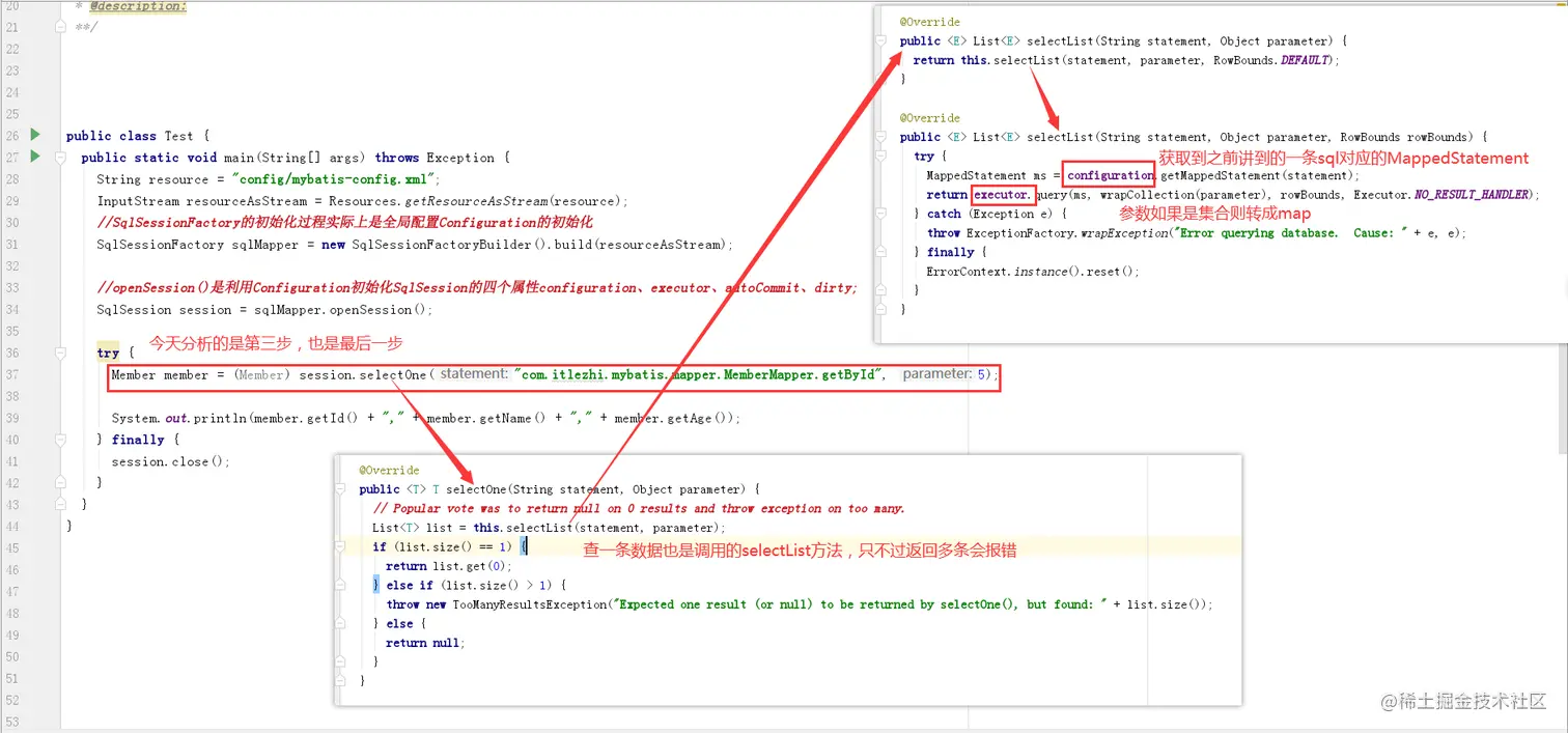 接下来看DefaultSqlSession的selectList方法,DefaultSqlSession重载了三个selectList方法,最终都会调用参数最全的那个方法。这个方法只有两个关键步奏:首先通过参数statement从全局配置configuration获取到对应的MappedStatement对象,然后使用得到的对象和参数parameter调用executor的query方法。其中参数statement就是最开始传递的参数“com.itlezhi.mybatis.mapper.MemberMapper.getById”,parameter对应参数5。