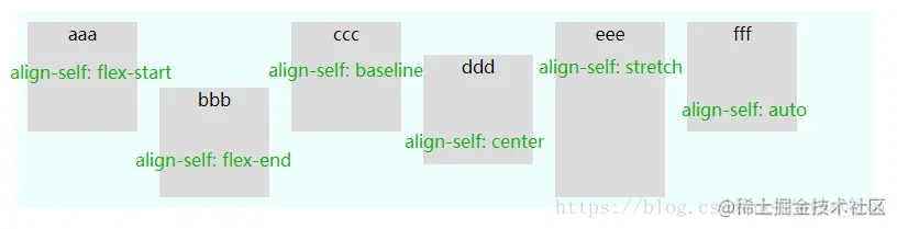 — align-self :项目的对齐方式,通过设置此属性,可以让项目和其他项目有不同的排列方式,可覆盖 align-items 属性。默认值为 auto,表示继承父元素的 align-items 属性,如果没有父元素,则等同于 stretch 。此属性有下图中的6个值可选择(除auto外,其他与align-items 可选值相同)。