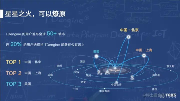 2020年,TDengine的用户已经遍布全球50+城市,云服务是未来,近20%的用户选择将TDengine部署在公有云上。令人欣喜的是,在我们还没有大力推广海外市场时,位于美国的用户数已经突破1,000+,日本、奥地利、德国、意大利等国家的用户数也早已突破100+。星星之火,大有燎原之势。