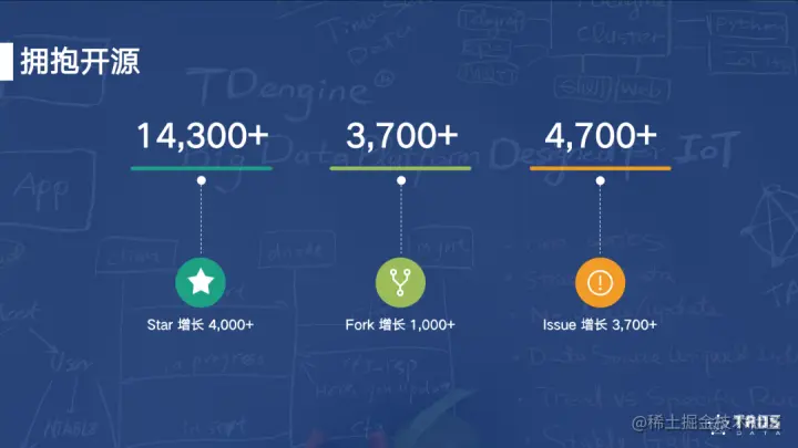TDengine 2019年7月12日将核心代码开源,2020年8月3日,再次加大开源力度,将大家最关注最刚需的集群功能开源。截止目前,TDengine在GitHub的Star数超过14,300,Fork数超过3,700,Issue数超过4,700。