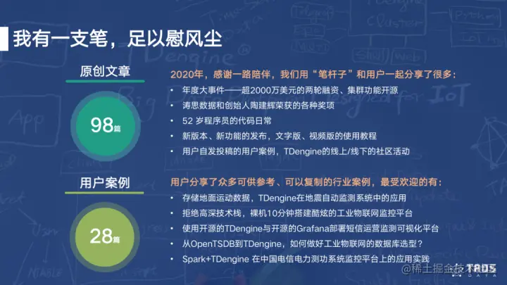 2020年,我们公众号上共发布98篇原创文章,“笔杆子”是宣传的“武器”,也是记录的“神器”,我们与用户一起分享故事:在全球开年即困难的Q1,TDengine团队奇迹般地完成了两轮共计2,000万美元的融资,8月3日,将最为刚需的集群功能开源;每一次重大更新的发布,文字版、视频版的使用教程;将经历化作文字的52岁程序员的日常;还有来自TDengine各行各业的用户提供的可供参考、可以复制的行业案例……
