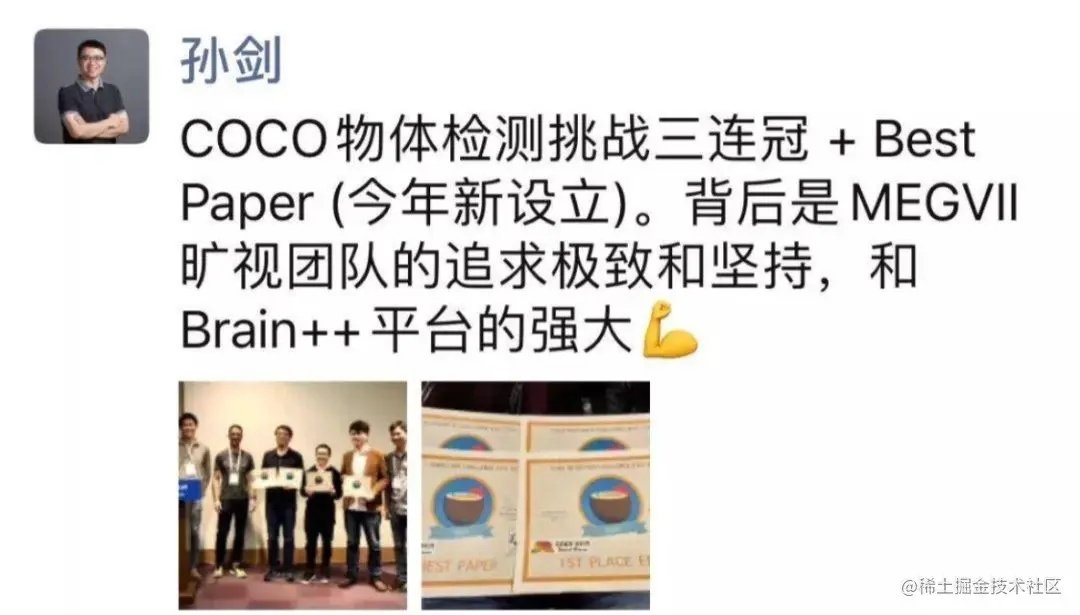 旷视首席科学家、研究院院长孙剑在2019年COCO夺冠后发的朋友圈
