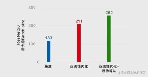 如图2所示,采用型号为2080Ti的GPU训练ResNet50,分别借助基准、亚线性、亚线性+遗传算法三种显存优化策略,对比了可使用的最大batch size。仅使用亚线性优化,batch size从133增至211,是基准的1.6x;而使用亚线性+遗传算法联合优化,batch size进一步增至262,较基准提升2x。