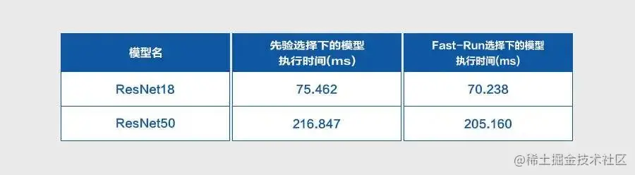 经典卷积网络上的实验测试证明了Fast-Run机制的自适应优势,优化效果明显,其模型执行效率优于先验选择下的执行效率,具体结果如下所示: