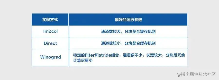卷积计算有多种优化实现,侧重点也各有不同,比如Im2col可以平衡内存占用和运行速度,Direct直接进行卷积计算优化,Winograd则是优化计算复杂度。每种优化实现都在特定的输入参数下有一定的优势,并随着推理平台的不同而发生变化,因此不够灵活,无法选择最优实现。上述实现的启发式偏好如下所示: