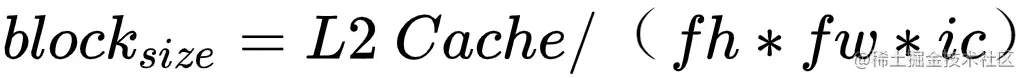 Im2col+MatMul优化卷积计算时,比如输出feature map的数据格式为 [n, oc, oh, ow],卷积核的大小为fh*fw,那么Im2col转换之后的数据格式为 [n, fh*fw*ic, oh*ow]。MegEngine的分块操作在oh*ow维度上,分块大小通过公式