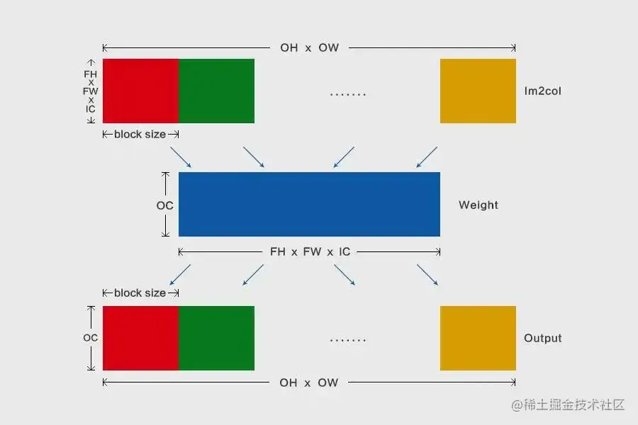 分块之后,不仅可以减少内存占用,还将提升数据访存效率,其原理图如下所示,把Im2col转换数据在其oh*ow维度上切块,接着,每个分块和weight进行矩阵乘,获取输出oh*ow维度上的一个分块: