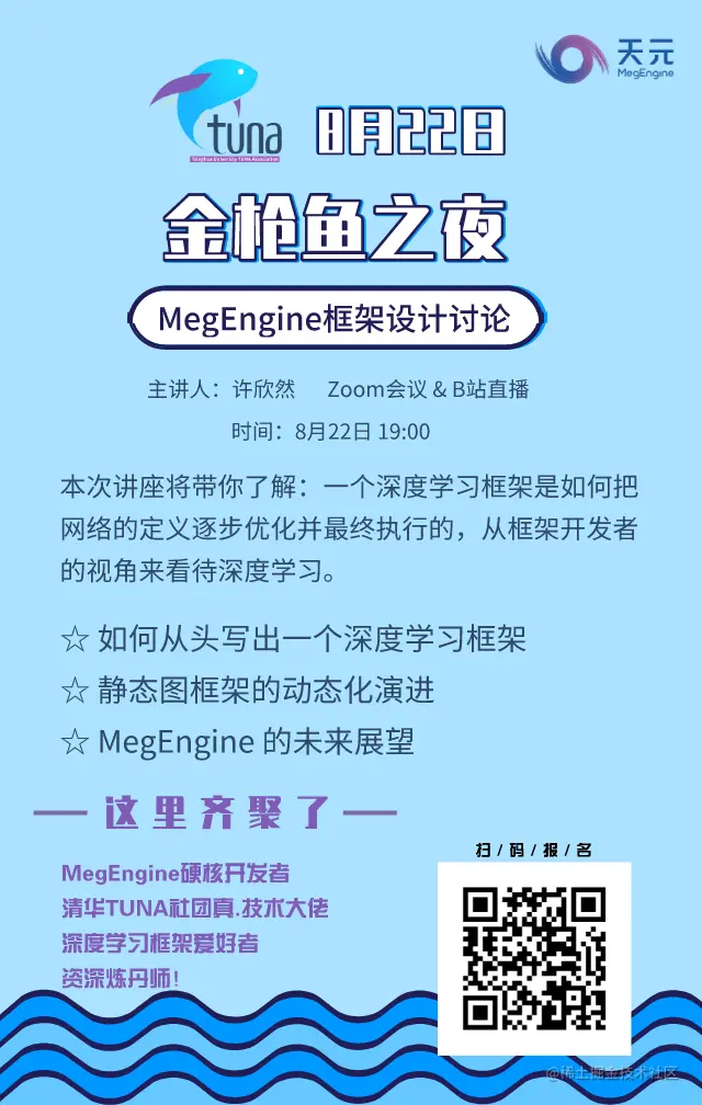 受清华大学学生网络与开源软件协会(TUNA)邀请,8月22日,旷视研究院 AI 系统高级技术总监、天元(MegEngine) 技术负责人许欣然(人称XXR,即是在开发者群中,同学好奇的那位各种解答大家疑问的“王牌客服”),将与大家分享MegEngine开发过程中的那些事儿,并介绍关于MegEngine和深度学习框架设计的基本知识,欢迎一起来玩!
