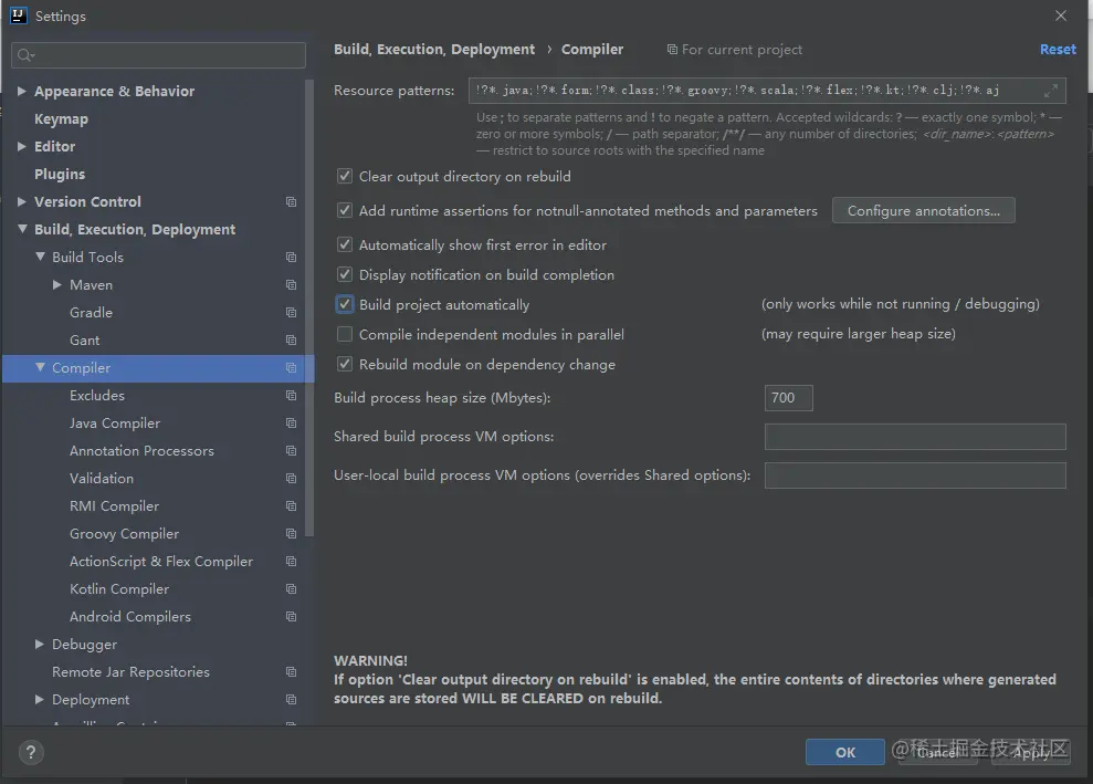 选择IDEA工具界面的【File】->【Settings】选项,打开Compiler面板设置页面