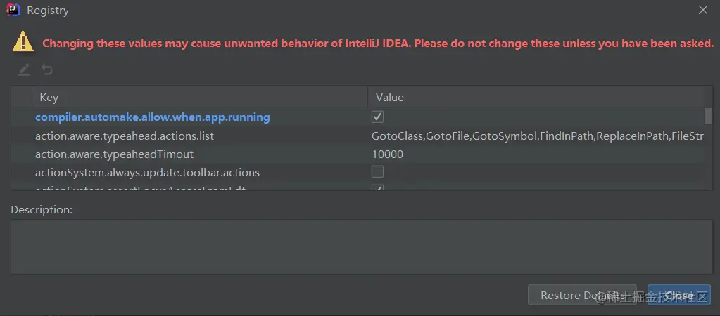 列表中找到“compiler.automake.allow.when.app.running”,将该选项后的Value值勾选,用于指 定IDEA工具在程序运行过程中自动编译,最后单击【Close】按钮完成设置。可以直接键盘输入搜索。
