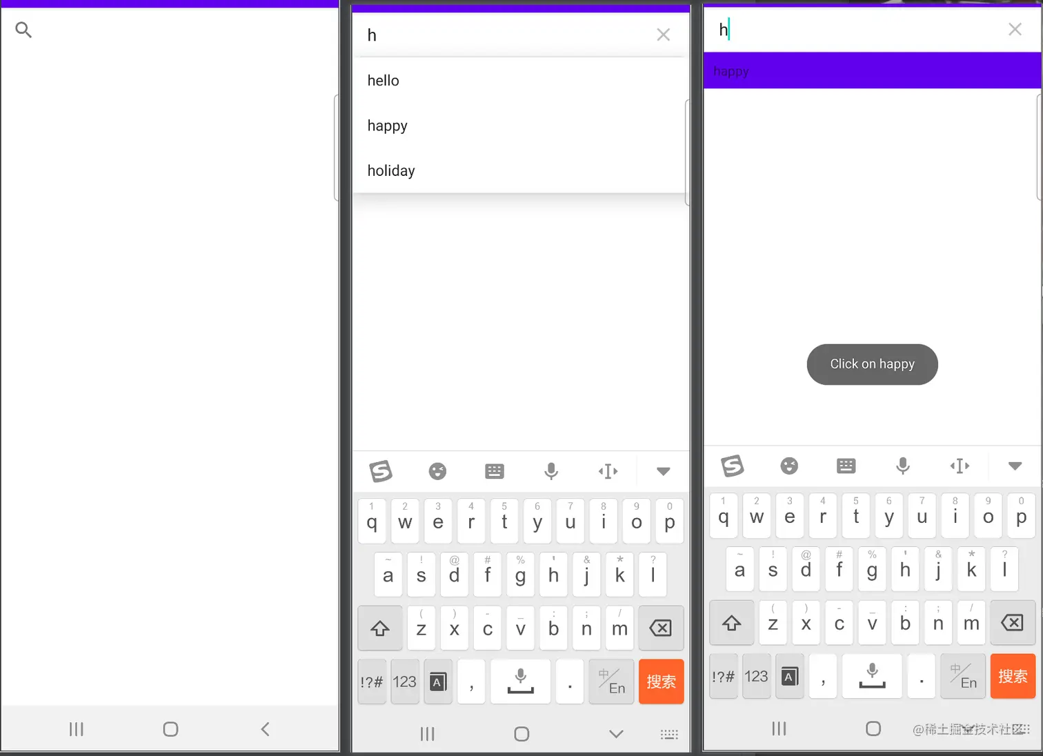 效果就是,点击搜索按钮,进入搜索页面,有输入就会开始匹配,输入框下会显示列表展示可选的项,点击可选项后会触发callback,弹一个toast同时一个textview展示结果。