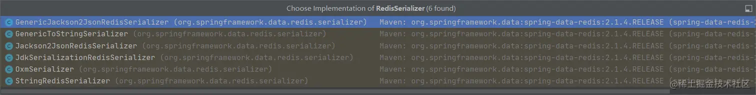 可以看出,RedisSerializer是一个Redis序列化接口,默认有6个实现类,这6个实现类代表了6种 不同的数据序列化方式。其中,JdkSerializationRedisSerializer是JDK自带的,也是RedisTemplate内 部默认使用的数据序列化方式,开发者可以根据需要选择其他支持的序列化方式(例如JSON方式)。