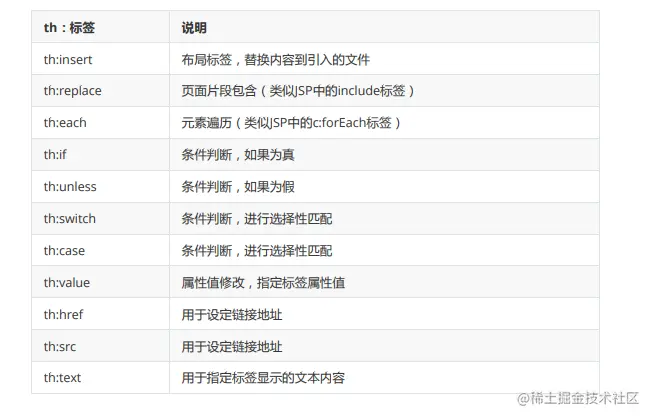 <!DOCTYPE html> <html lang="en" xmlns:th="http://www.thymeleaf.org"> <head> <meta charset="UTF-8"> <link rel="stylesheet" type="text/css" media="all" href="../../css/gtvg.css" th:href="@{/css/gtvg.css}" /> <title>Title</title> </head> <body> <p th:text="${hello}">欢迎进入Thymeleaf的学习</p> </body> </html> 上述代码中,“xmlns:th="www.thymeleaf.org"“ 用于引入Thymeleaf模板引擎标签,使用 关键字“th”标注标签是Thymeleaf模板提供的标签,其中,“th:href”用于引入外联样式文件,“th:text”用 于动态显示标签文本内容。 除此之外,Thymeleaf模板提供了很多标签,接下来,通过一张表罗列Thymeleaf的常用标签