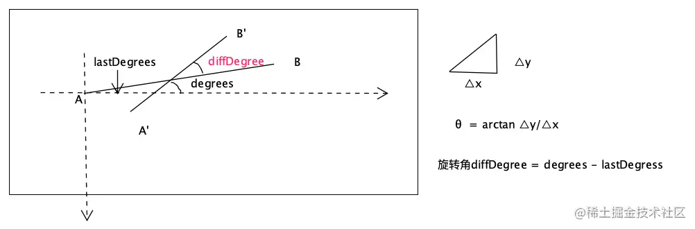 旋转角度 旋转角度的计算稍微比较复杂,我们需要先计算当前双指连线的夹角degrees, 来减去上一次我们记录的手指连线夹角lastDegrees,才能得到本次旋转的角度diffDegree = degrees - lastDegrees。如图所示: