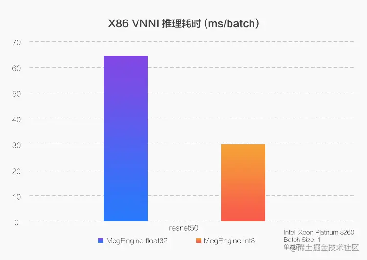 在新一代至强(Xeon)处理器上,通过使用 VNNI(Vector Neural Network Instructions)指令,MegEngine 将 CPU 的 int8 推理性能优化到了浮点性能的 2~3 倍。