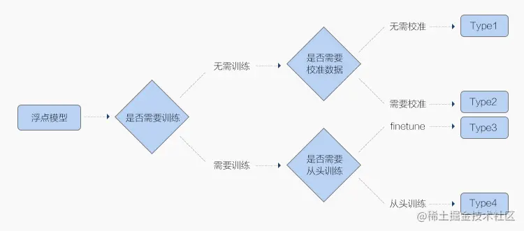 Type1 和 Type2 由于是在模型浮点模型训练之后介入,无需大量训练数据,故而转换代价更低,被称为后量化(Post Quantization),区别在于是否需要小批量数据来校准(Calibration);