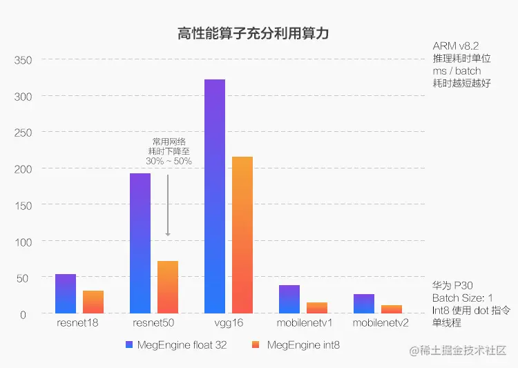 ARM v8.2 主要的特性是提供了新的引入了新的 fp16 运算和 int8 dot 指令,MegEngine基于此进行一系列细节优化(细节:四个int8放到一个128寄存器的32分块里一起算),最终实现了比浮点版本快2~3倍的速度提升