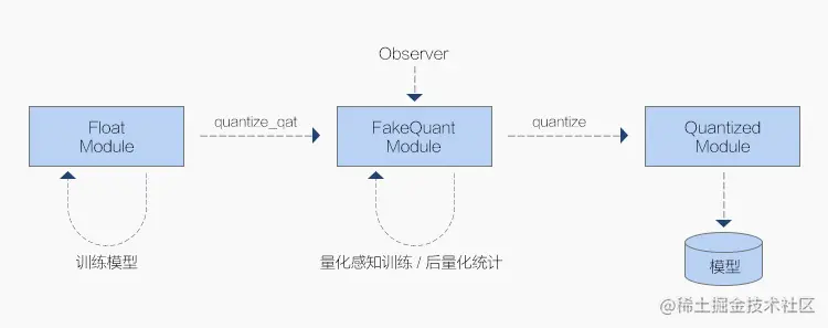 如上图,用户首先在普通 Module 上进行正常的模型训练工作。训练结束后可以转换至 QFloat 模型上,通过配置不同的 Observer 和假量化算子来选择不同的量化参数 scale 获取方式,从而选择进行 QAT 或 Calibration 后量化。之后可以再转换至 Q 模型上,通过 trace.dump 接口就可以直接导出进行部署。