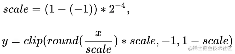 尽管不同量化算法可能在假量化的具体实现上有所区别,但是一般都会有一个“截断”的操作,即把数值范围较大的浮点数转换成数值范围较小的整数类型,比如下图,输入一个[-1, 1)范围的浮点数,如果转换为 4 位整型,则最多只能表示 2^4 个值,所以需要将输入的范围划分为16段,每段对应一个固定的输出值,这样就形成了一个类似分段函数的图像,计算公式为: