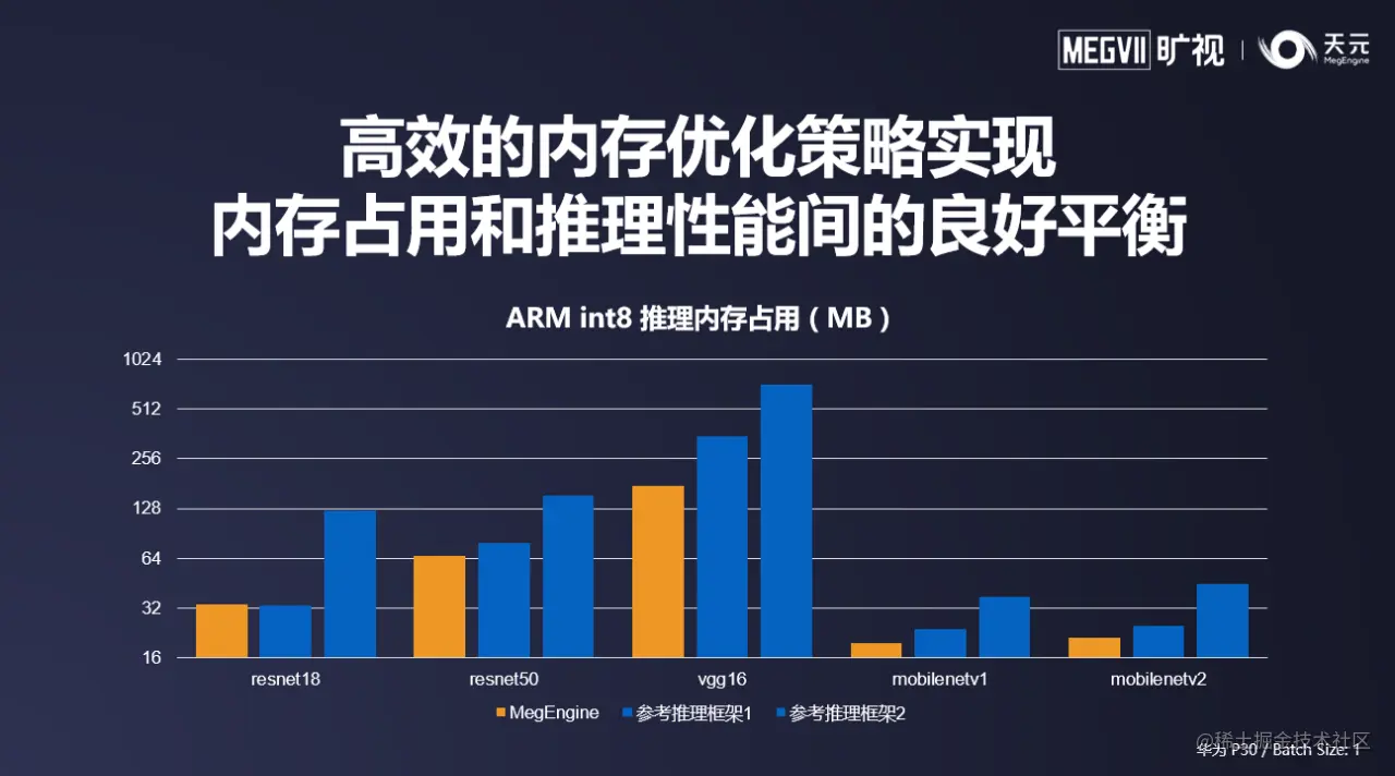 深度学习应用中,运行时的内存占用是一个重要的指标。由于天元的自动内存优化策略在训练侧得到了充分的打磨,天元可以在内存占用和推理性能之间取得良好的平衡。