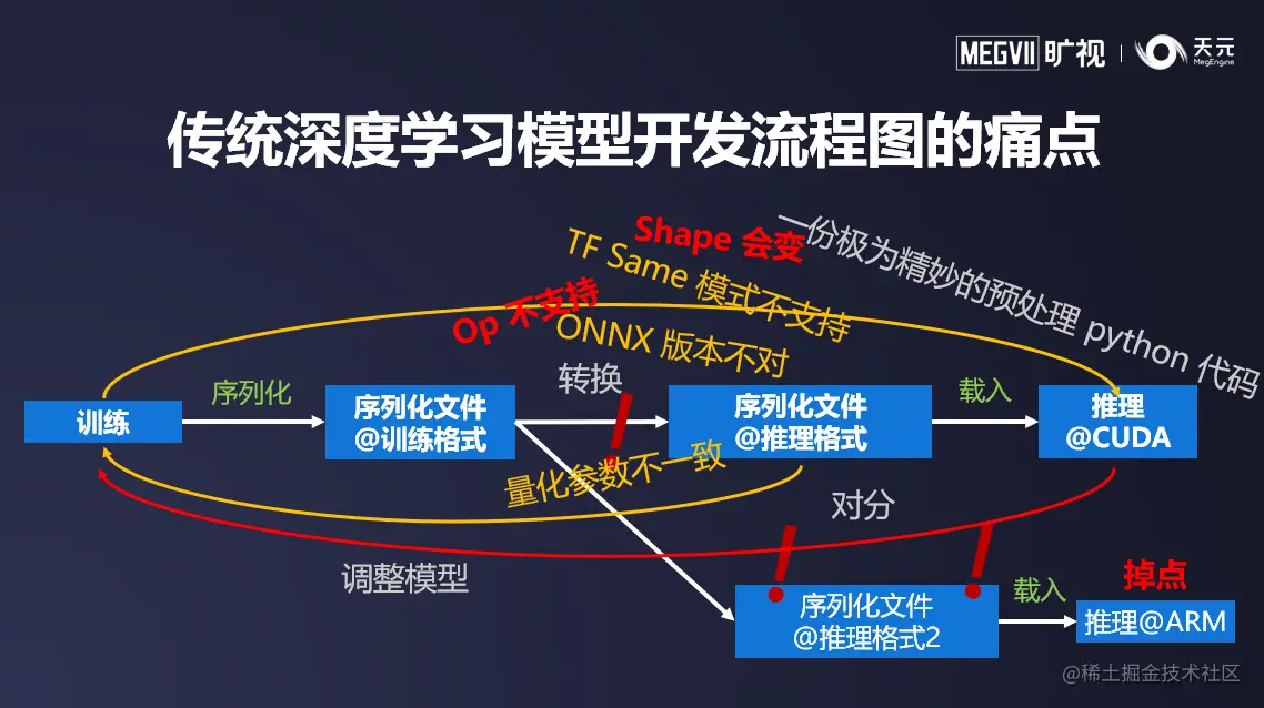 所谓训练推理一体,就是让训练与推理不再是完全孤立的两个步骤。为什么训推一体如此重要?在传统深度学习模型开发流程中,从训练到推理,开发者需要经过一系列格式转换。但随之而来的也会有种种复杂难题,比如推理框架对算子不支持、作为中间转换格式的 ONNX 版本不一致,转换成 Caffe 过程中存在一些层的中间形状变化导致无法转换,涉及到量化模型时量化参数的定义不一致等,都会增大转换的难度。