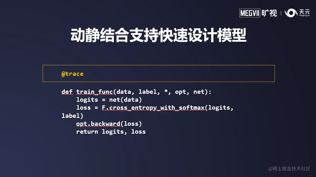 动态图训练对程序员友好,可以随时停下来 Debug;而静态图的训练好处是可以让训练的精度、内存消耗和训练速度达到最优。如何兼得动态图训练和静态图训练的好处?天元通过动静结合支持快速模型设计。动态模式下,天元可以方便的排查模型问题,在遇到错误后及时停下,便于分析模型结构上的异常问题。通过添加一行 trace,模型可以被直接转换为静态图模式,获得静态图所独有的图优化,一方面可以更好的对显存进行复用,提高显存利用率,另一方面可以优化计算顺序,提升模型的训练性能。