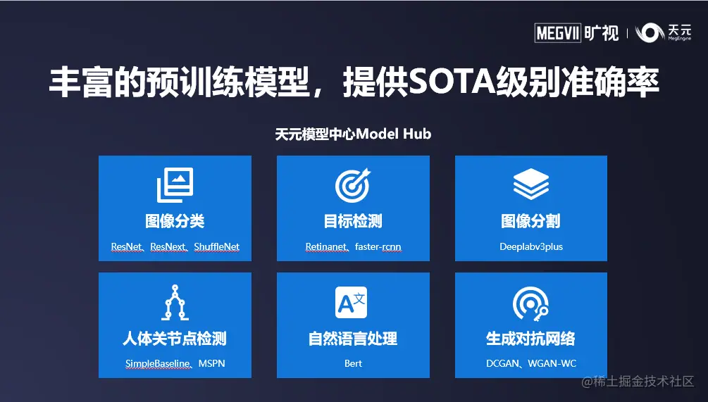 在使用上,天元模型中心 Model Hub 提供了丰富的预训练模型,包括图像分类、目标检测、图像分割等模型,并且每个模型都提供了 SOTA 级别准确率,让使用者可以便捷的上手天元,站在巨人的肩膀上开始自己的科研工作。