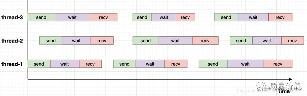 - 同一线程中连续的两个请求之间存在等待时间这种概念,即图中的空白处