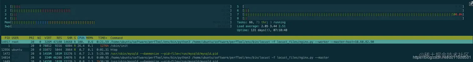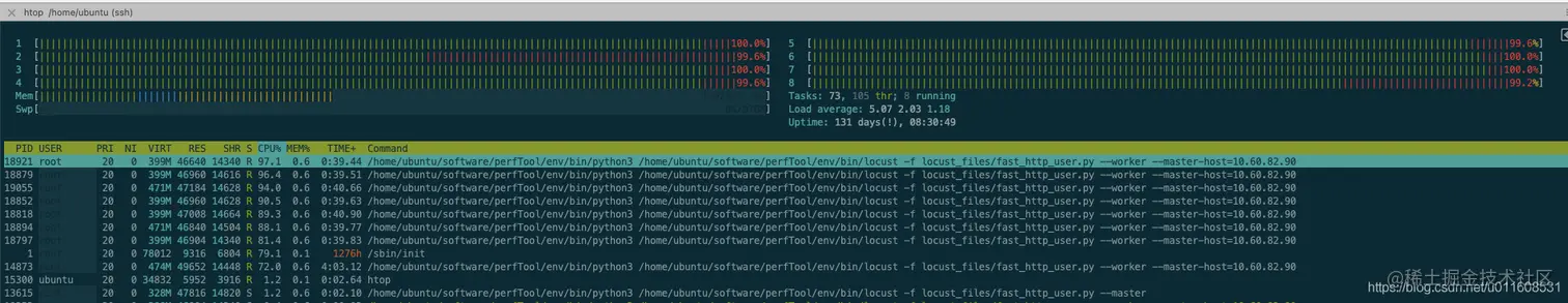 Locust: (CPU:100%, 单核CPU达到瓶颈)