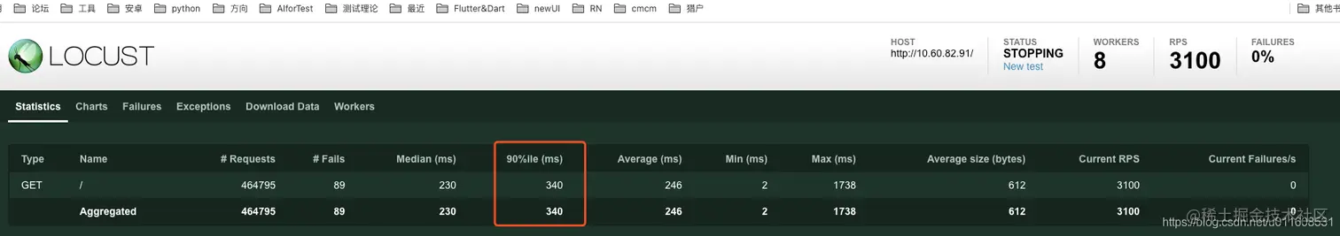 比如当Locust normal模式下,8进程,CPU瓶颈后,90%响应时间为340ms。同时wrk获取的响应时间为59.41ms.