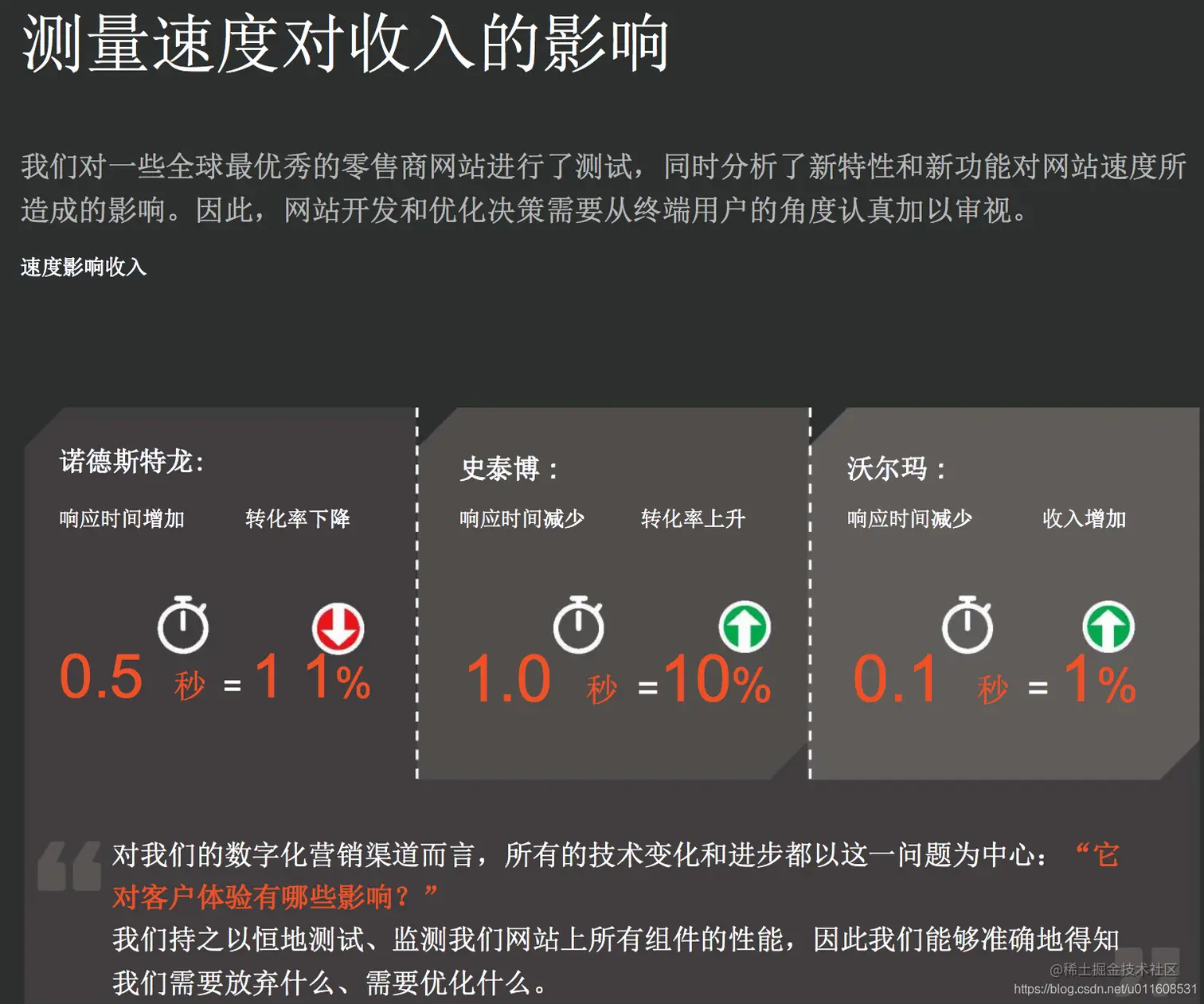 从图中可以看到,响应时间对转化率的影响非常大,比如沃尔玛够硬核了吧,沃尔玛的响应时间降低0.1秒,收入即可增加1%,是非常大的收入提升。
