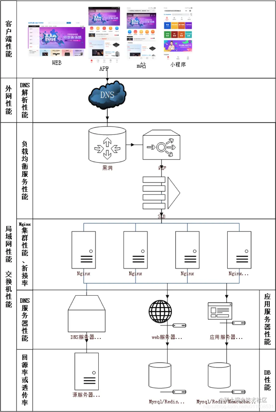 以中小型电商网站为例,如下图所示,性能基本组成: