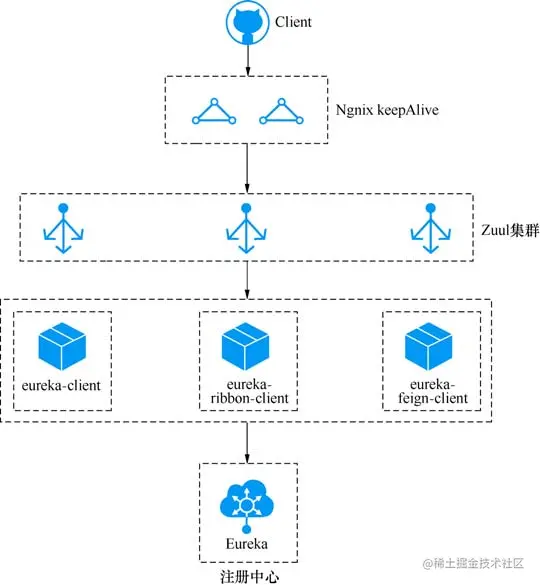 另外一种常见的集群是通过 Ngnix 和 Zuul 相互结合来做负载均衡。暴露在最外面的是 Ngnix 主从双热备进行 Keepalive,Ngnix 经过某种路由策略,将请求路由转发到 Zuul 集群上, Zuul 最终将请求分发到具体的服务上。