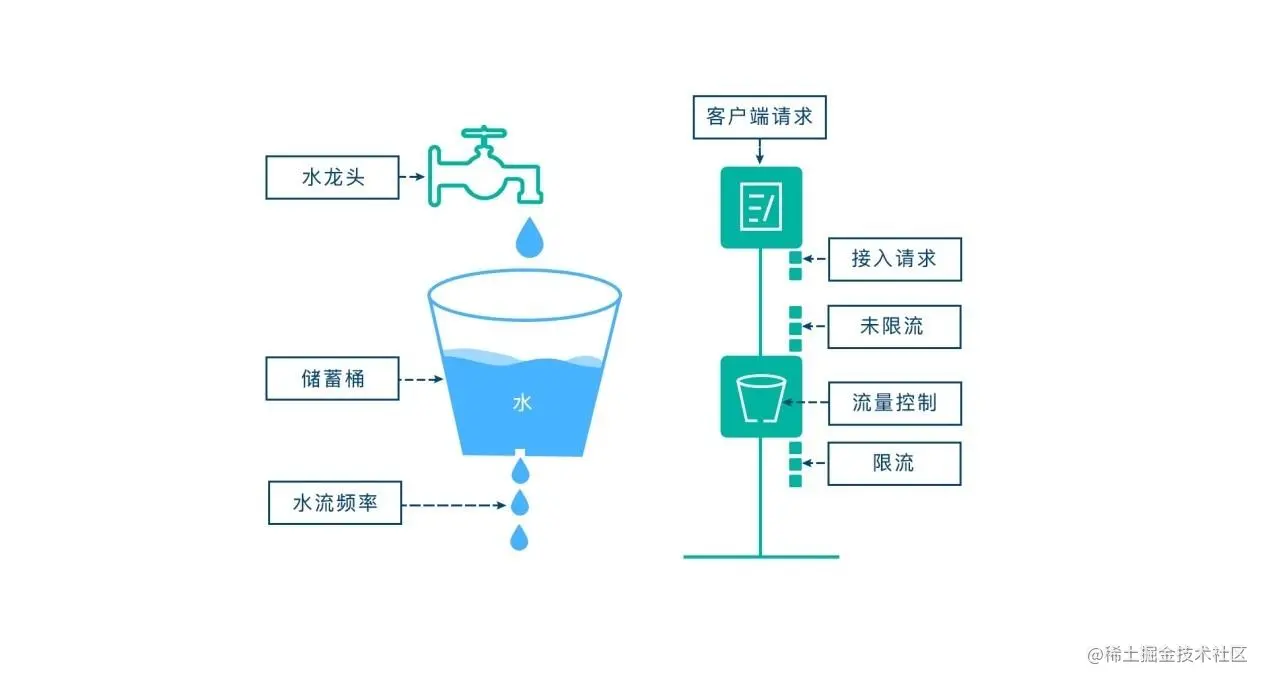 - 请求速度大于漏桶流出水滴的速度:也就是请求数超出当前服务所能处理的极限,将会触发限流策略。