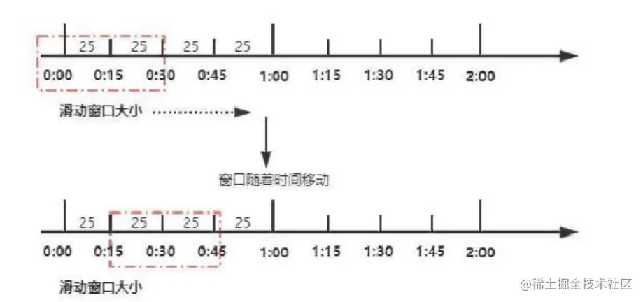 我们将一分钟拆分为4个小时间窗口,每个小时间窗口最多能够处理25个请求。并且通过虚线框表示滑动窗口的大小(当前窗口的大小是2,也就是在这个窗口内最多能够处理50个请求)。同时滑动窗口会随着时间往前移动,比如前面15s结束之后,窗口会滑动到15s~45s这个范围,然后在新的窗口中重新统计数据。这种方式很好地解决了固定窗口算法的临界值问题。 Sentinel就是采用滑动窗口算法来实现限流的。