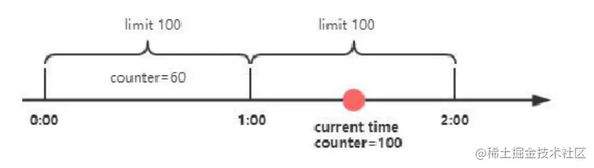 限定了每一分钟能够处理的总的请求数为100,在第一个一分钟内,一共请求了60次。接着到第二个一分钟,counter又从0开始计数,在一分半钟时,已经达到了最大限流的阈值,这个时候后续的所有请求都会被拒绝。