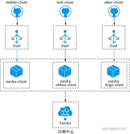 一种常见的使用方式是对不同的渠道使用不同的 Zuul 来进行路由,例如移动端共用一个 Zuul 网关实例,Web 端用另一个 Zuul 网关实例,其他的客户端用另外一个 Zuul 实例进行路由。 这种不同的渠道用不同 Zuul 实例的架构。